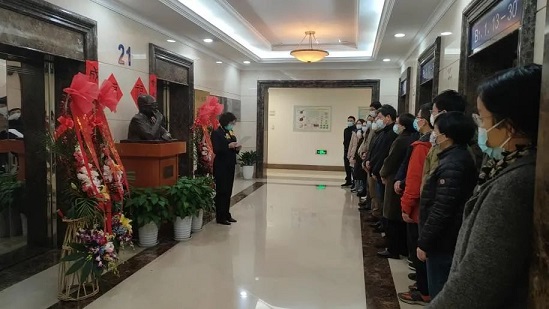 参加纪念活动的史地所教师首先向位于光华楼西主楼21楼的谭其骧先生铜像鞠躬致敬并敬献花篮,默哀思念。随后张晓虹所长致辞,缅怀谭其骧先生对中国历史地理学的贡献和复旦大学历史地理学科建设的开创之功,勉励本所同仁在对标国家重大战略中,不忘初心,牢记使命,继承谭先生务实求真的优良学术传统,为国家和社会做出更大的贡献。